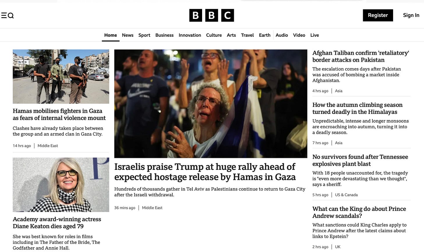 Yesterday at Hostage Square, crowds gathered to celebrate the release of Israeli hostages — a rare moment of relief after months of trauma. And yet, here’s the BBC’s front page today: “Israelis praise Trump at huge rally ahead of expected hostage release by Hamas in Gaza” — complete with a photo that looks like people are praying to Trump himself. Subtle as ever. It’s not news; it’s a mood board for mockery. Because if the BBC can frame a moment of national gratitude as a cult meeting, they will — anything to make Israelis look foolish and keep the Trump-hate engagement flowing.