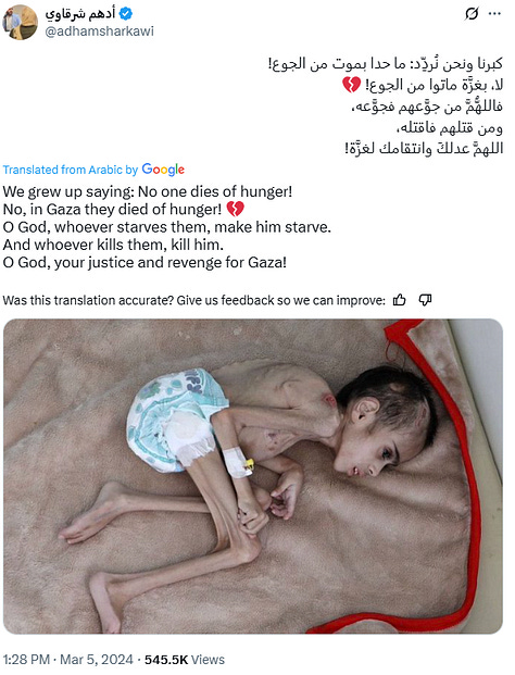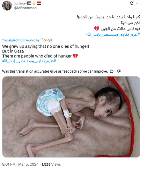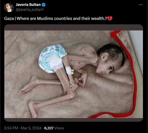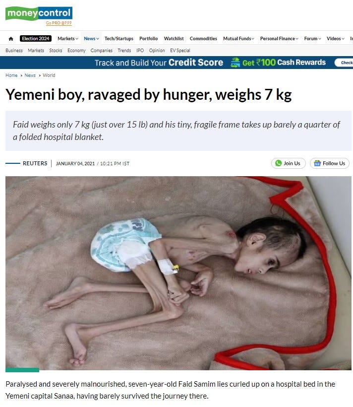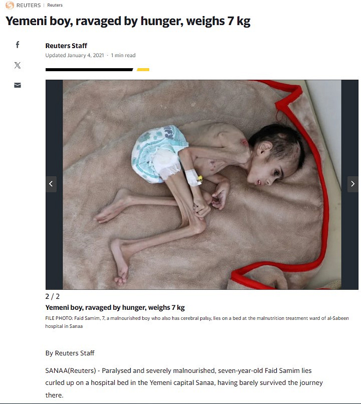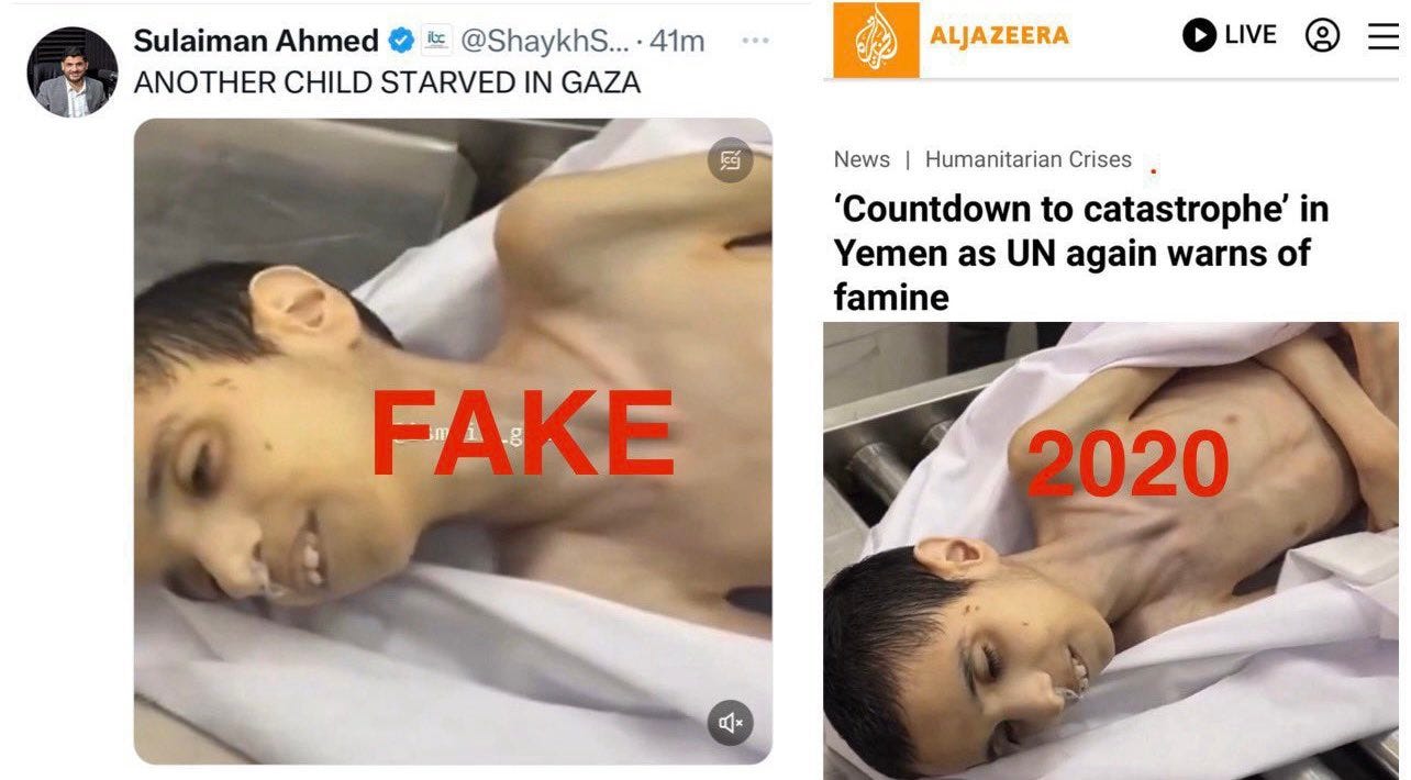 A Yemeni boy, ravaged by hunger: . Like hundreds of similar images from Yemen and Syria, it circulated on social media, presented as proof that Israel is starving children in Gaza.