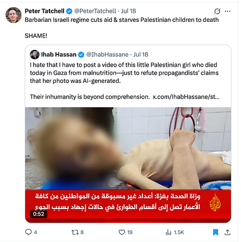 At the heart of the latest manufactured famine drama lies a single heart- wrenching image: Mohammed, a skeletal Gazan child, held by his visibly distressed mother. The photo, snapped by Ahmed Jihad Ibrahim Al-Arini and conveniently licensed to Anadolu—Turkey’s state-run news agency—was unleashed onto Instagram on 22 July 2025. But as David Collier’s sharp-eyed investigation reveals, similar pictures were already floating around. Another Gazan social media user, Saeed Mohammed, uploaded nearly identical images even earlier, neatly demolishing claims that Mohammed’s photo was some spontaneous journalistic scoop.