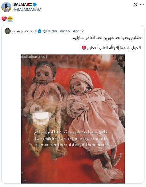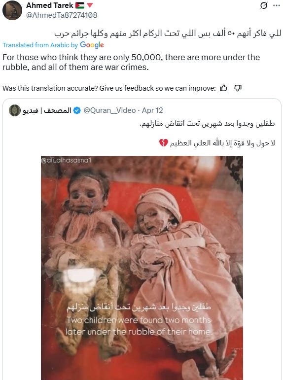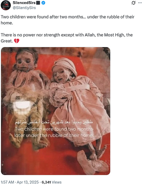 There are thousands of images like these—and they’re all fake. If there really were a genocide, you wouldn’t need a Photoshop department and rented grief, would you? I’ve got the lot and I’ll roll them out in a series of videos and posts—there isn’t room here. It’s grim work; my heart genuinely aches wading through it. But it’s my duty—as a human being and, yes, a non-Jew—to help the Jewish nation fight demonisation and the old blood libel.