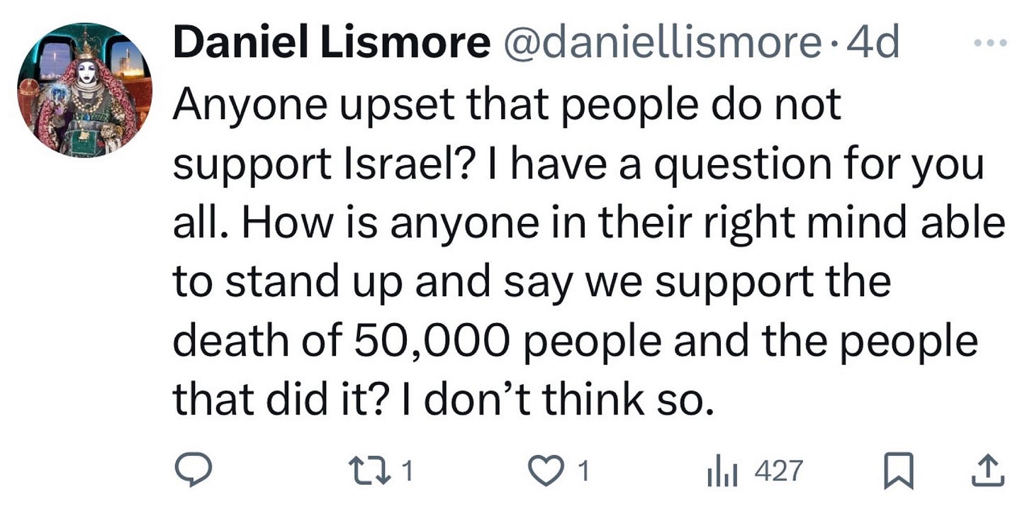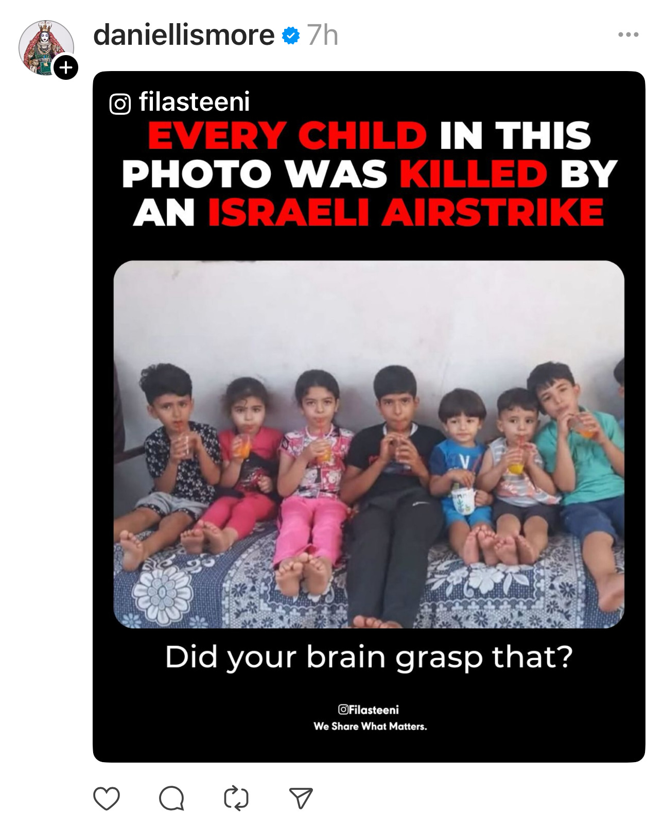 Take that banal meme he posted of five kids on a couch with a sign screaming, "EVERY CHILD IN THIS PHOTO WAS KILLED BY AN ISRAELI AIRSTRIKE. Did your brain grasp that?" It's just a meme, not a fact or news, yet it's meant to gut-punch. Or consider his other post: