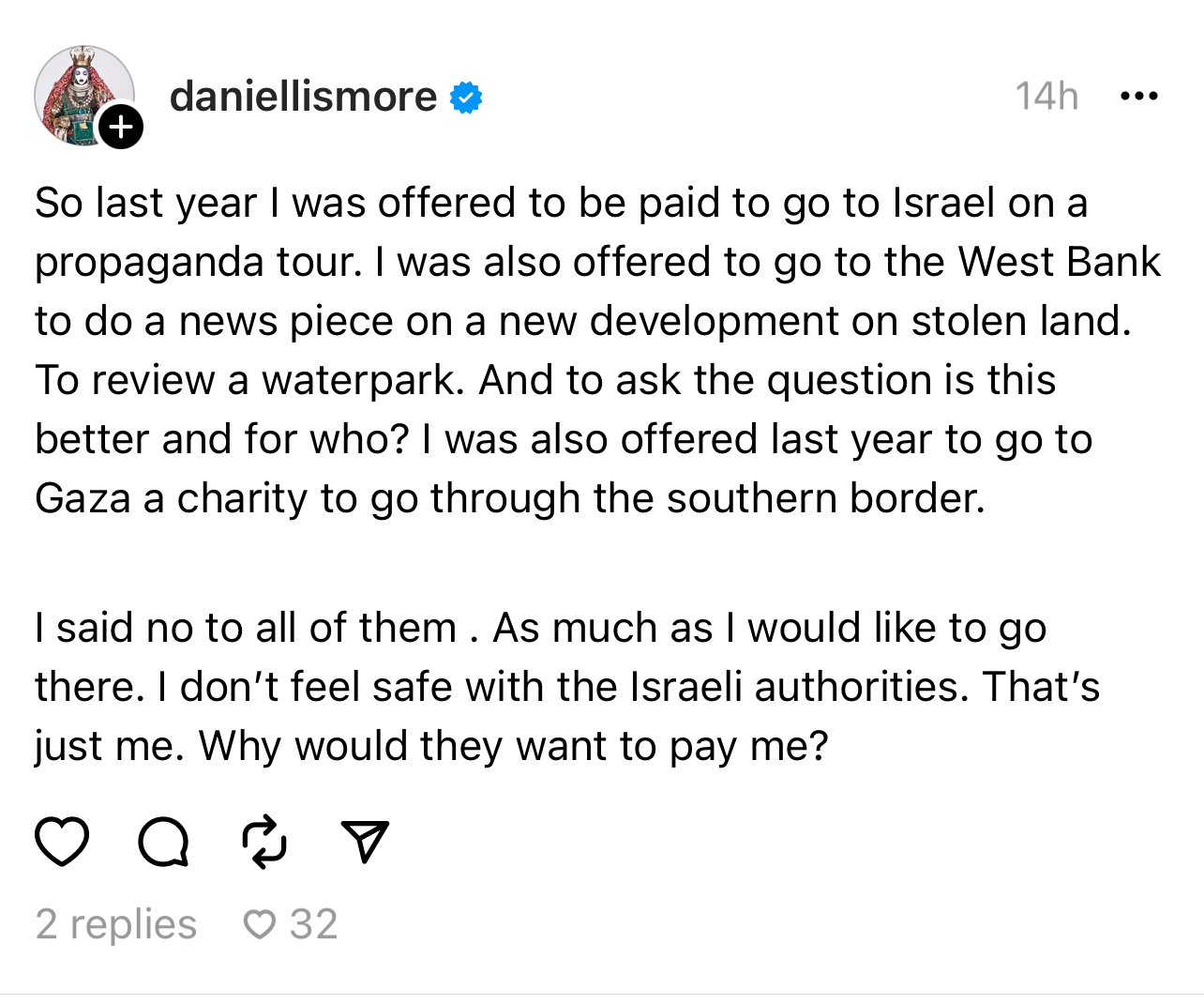 Such claims revive antisemitic stereotypes—ugly myths that cast Jewish people or Israel as cunning puppet-masters orchestrating global affairs. Born from centuries of prejudice, these ideas aren't just nonsense; they're dangerous, fuelling mistrust and justifying harm. When he tosses out this "propaganda tour" yarn, he's not merely fibbing—he's leaning into a caricature that thrives on division. His followers, lapping it up without question, spread it further, risking real-world consequences. Activism isn't a trendy game to play for likes, yet he hops from cause to cause, treating grave issues like props for his personal stage. That's not clever; it's reckless, turning suffering into a punchline when the world needs truth, not clichés.